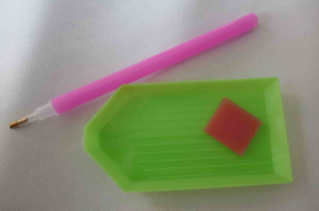 There’s a little tool you press in the pink block which acts a bit like glue. It makes it easier to pick up the little dots and press it on the picture.